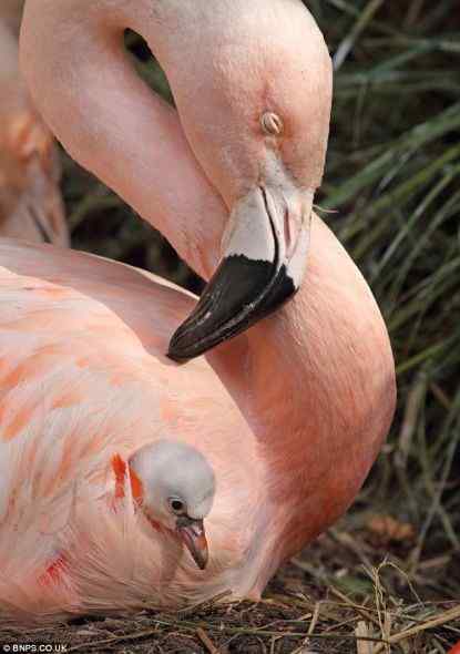 在美国西雅图的一家动物园,摄影师捕捉到一只粉红色小智利火烈鸟可爱的小火烈鸟依偎在...