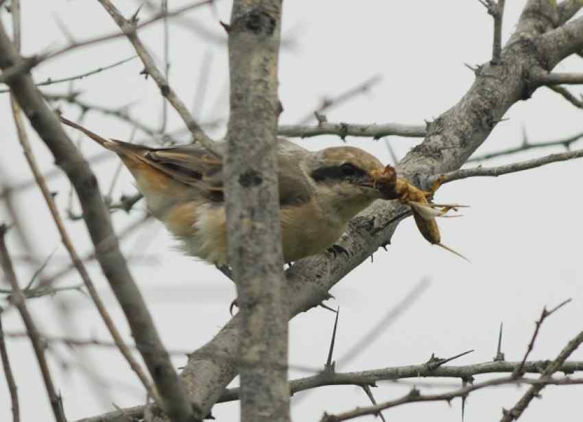 红尾伯劳将食物悬挂撕食