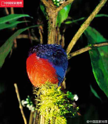中国国家地理:石榴红八色鸫羽毛鼓起的时候就像一只球,它在夜间睡眠时,通常会把头深...