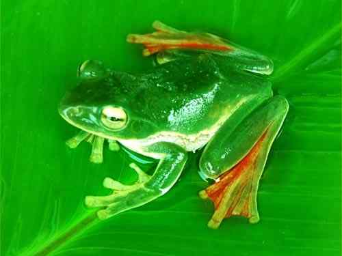 飞蛙:科学家曾在2007年对这种通体翠绿、红蹼的树蛙进行过描述。因为它的蹼足很大,可令其在下落过程中滑翔,故称“飞蛙”(学名Rhacophorus suffry)